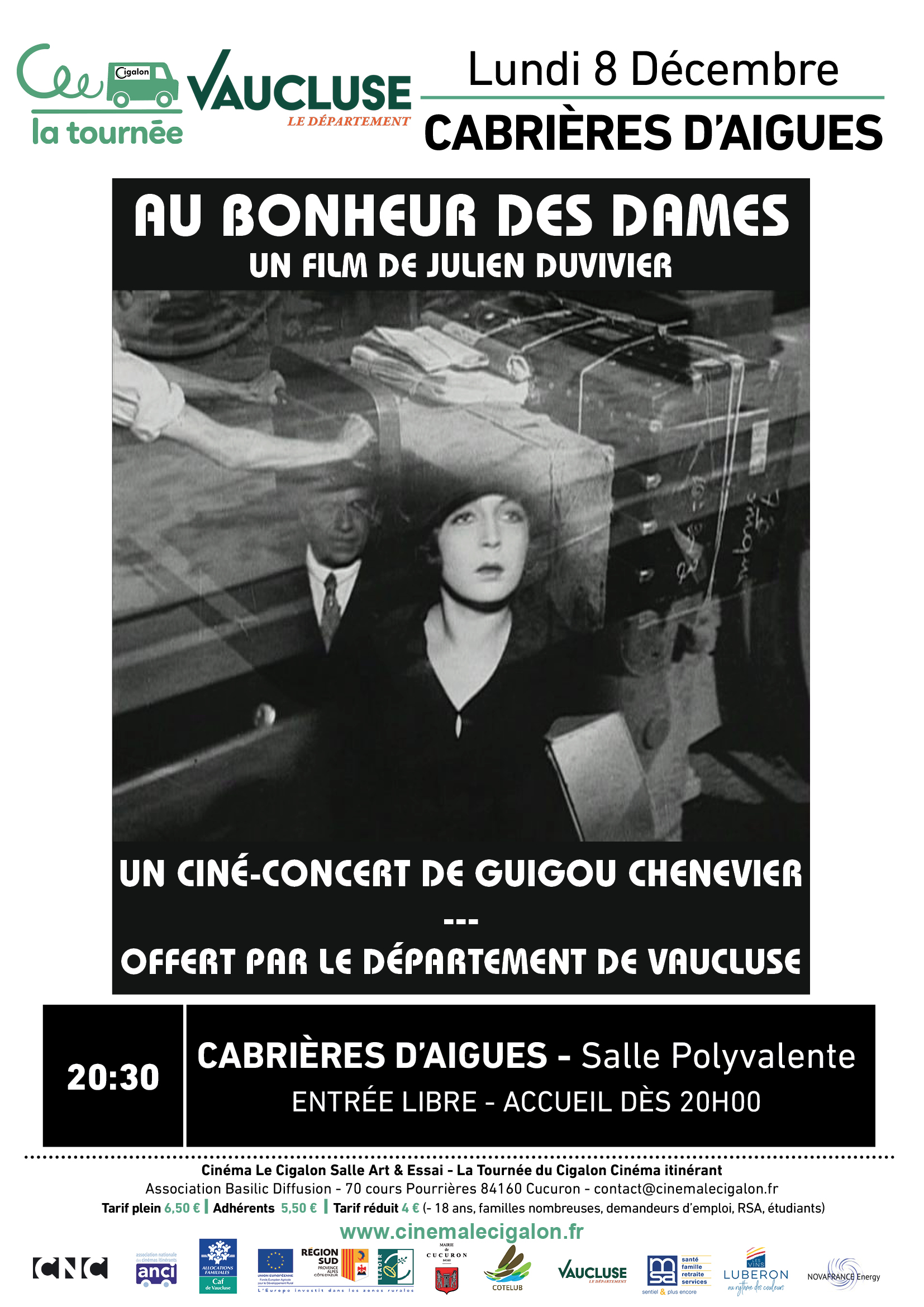 | Ciné-Concert à CABRIÈRES D'AIGUES, Salle Polyvalente Lundi 8 Décembre à 20H30 - Entrée Libre Offert par le département de Vaucluse AU BONHEUR DES DAMES Un film de Julien Duvivier Avec Dita Parlo, Pierre de Guingand, Germaine Rouer