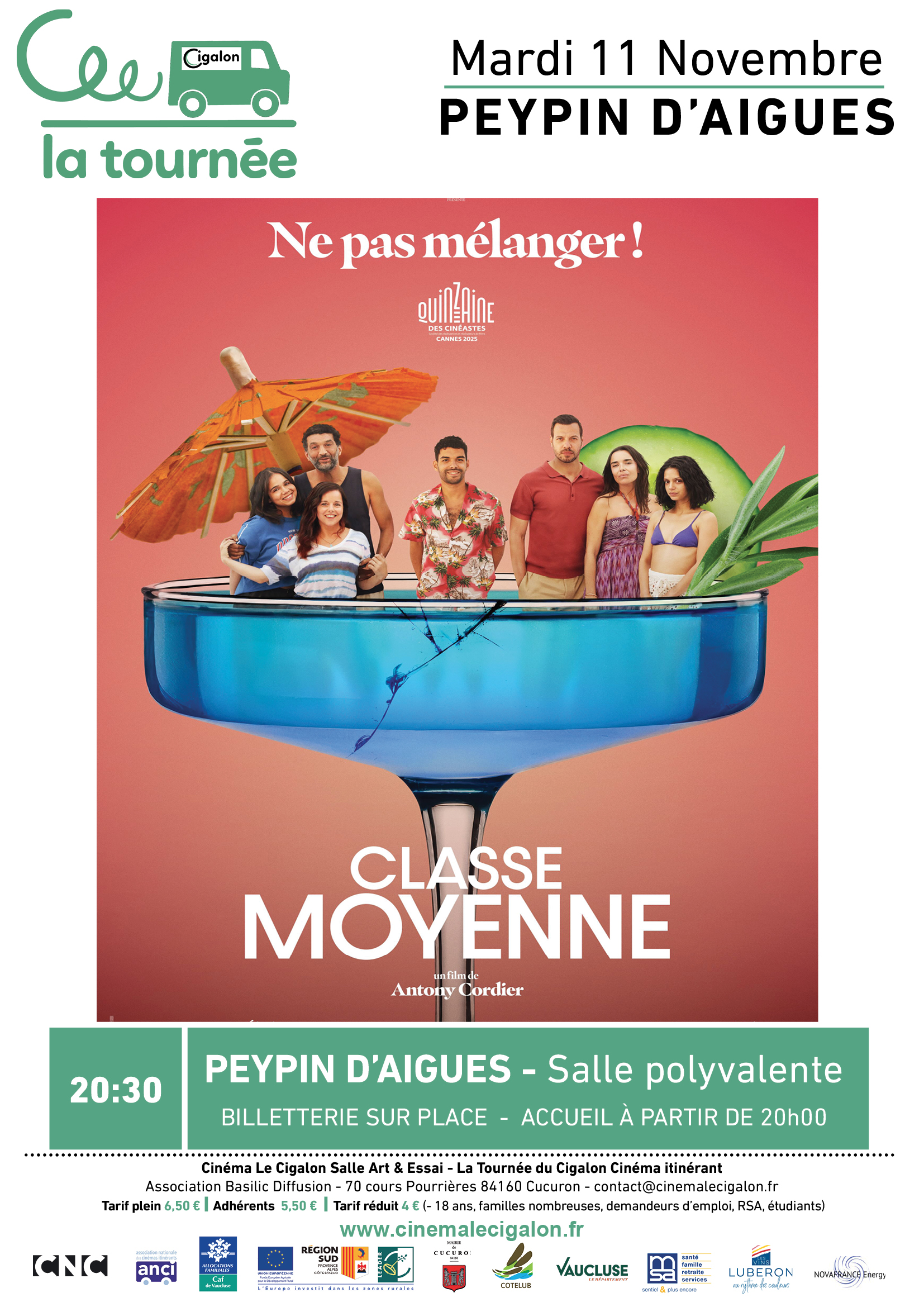 | À PEYPIN D'AIGUES, Salle Polyvalente Mardi 11 Novembre à 20H30 CLASSE MOYENNE Un film de Antony Cordier Avec Laurent Lafitte, Élodie Bouchez, Ramzy Bedia Comédie - France - 2025 – 1H35 Chris et Antoine ont bien du mal à s’entendre depuis leur divorce. Mais, lorsqu’on leur annonce que leur fils de 16 ans est atteint d’une maladie rare, qui va lui faire perdre la vue, ils s’efforcent de mettre leurs rancœurs de côté. Les ex-conjoints embarquent leur fils pour des vacances inoubliables, bien décidés à lui offrir ses plus beaux souvenirs.  | |