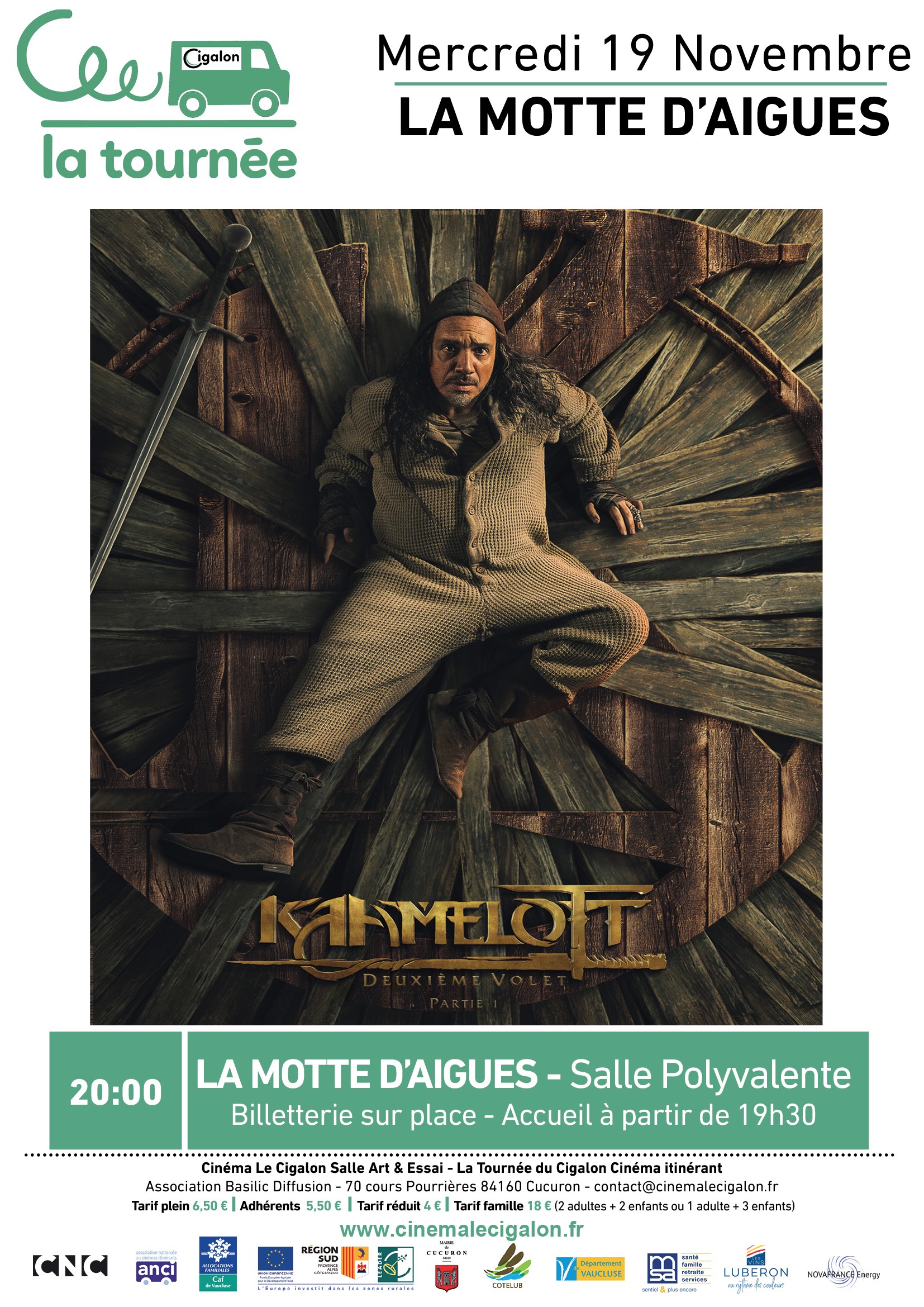 | À LA MOTTE D'AIGUES, Salle Polyvalente Mercredi 19 Novembre à 20H00 KAAMELOTT - DEUXIÈME VOLET Partie 1 Un film de Alexandre Astier Avec Alexandre Astier, Anne Girouard, Jean-Christophe Hembert Aventure, Comédie - France - 2025 – 2H19 Les Dieux sont en colère contre Arthur?! Après la destruction de Kaamelott, son refus obstiné de tuer Lancelot précipite le Royaume de Logres à sa perte. Il réunit ses Chevaliers, novices téméraires et vétérans désabusés, autour de la Nouvelle Table Ronde et les envoie prouver leur valeur aux quatre coins du Monde, des Marais Orcaniens aux terres glacées du Dragon Opalescent. | |