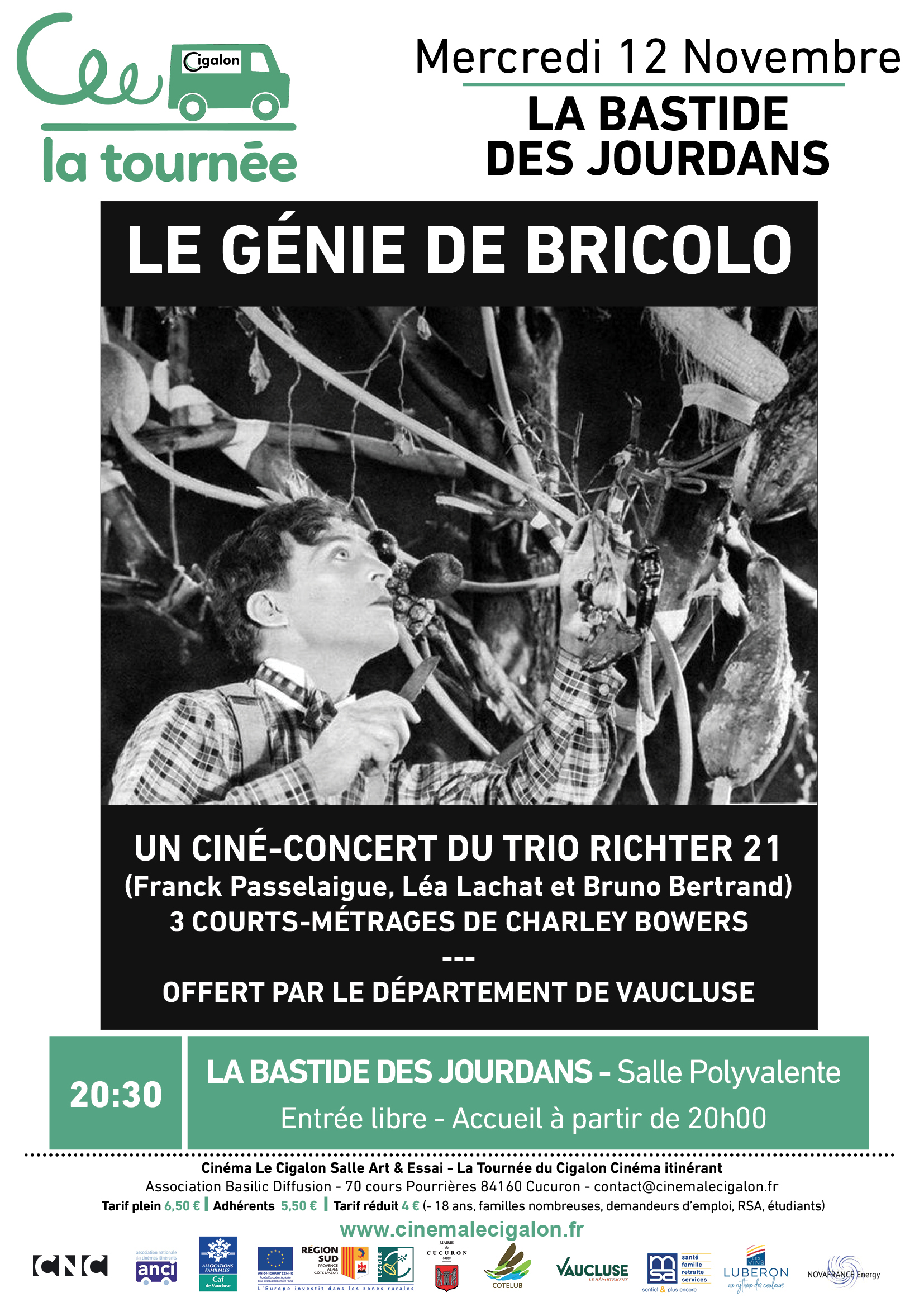 | Ciné-concert à LA BASTIDE DES JOURDANS, Salle Polyvalente Mercredi 12 Novembre à 20H30 - Entrée libre LE GÉNIE DE BRICOLO Trois courts-métrages de Charley Bowers 1. EGGED ON (Pour épater les poules), 1926, 24'08" 2. A WILD ROOMER (Un drôle de locataire), 1926, 24'27" 3. NOW YOU TELL ONE (Non tu exagères), 1926, 22'18" Avec Franck Passelaigue: Compositions, Guitare électrique Franck Passelaigue Offert par le département de Vaucluse  | |