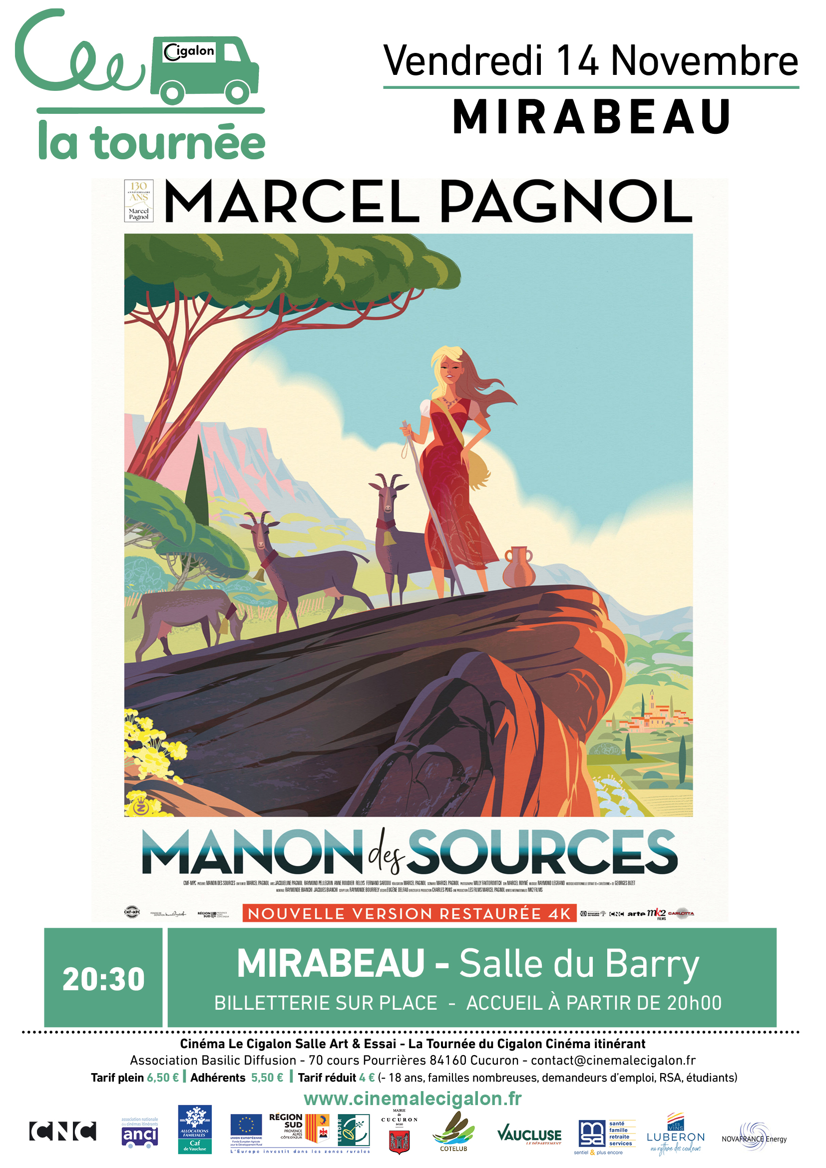 | À MIRABEAU, Salle du Barry Vendredi 14 Novembre à 20H30 MANON DES SOURCES Un film de Marcel Pagnol Avec Jacqueline Pagnol, Raymond Pellegrin, Rellys, Henri Poupon Comédie dramatique - France - 1952 – 1H57 Manon, bergère sauvage animée du désir de se venger, ne se contente pas de repousser les avances du pauvre Ugolin qui clame à tout vent sa passion. Elle détourne la source qui alimente en eau la fontaine communale. Le village tout entier est condamné à mort.  | |