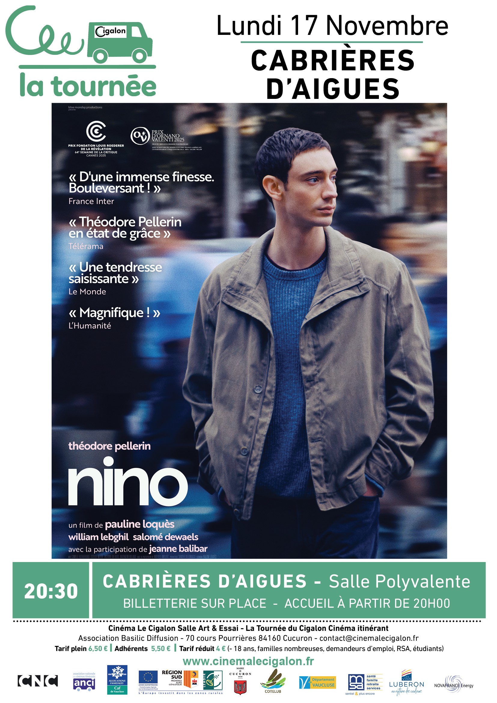 | À CABRIÈRES D'AIGUES, Salle Polyvalente Lundi 17 Novembre à 20H30 NINO Un film de Pauline Loquès Avec Théodore Pellerin, William Lebghil, Salomé Dewaels Drame - France - 2025 – 1H37 Dans trois jours, Nino devra affronter une grande épreuve. D’ici là, les médecins lui ont confié deux missions. Deux impératifs qui vont mener le jeune homme à travers Paris, le pousser a? refaire corps avec les autres et avec lui-même.  | |