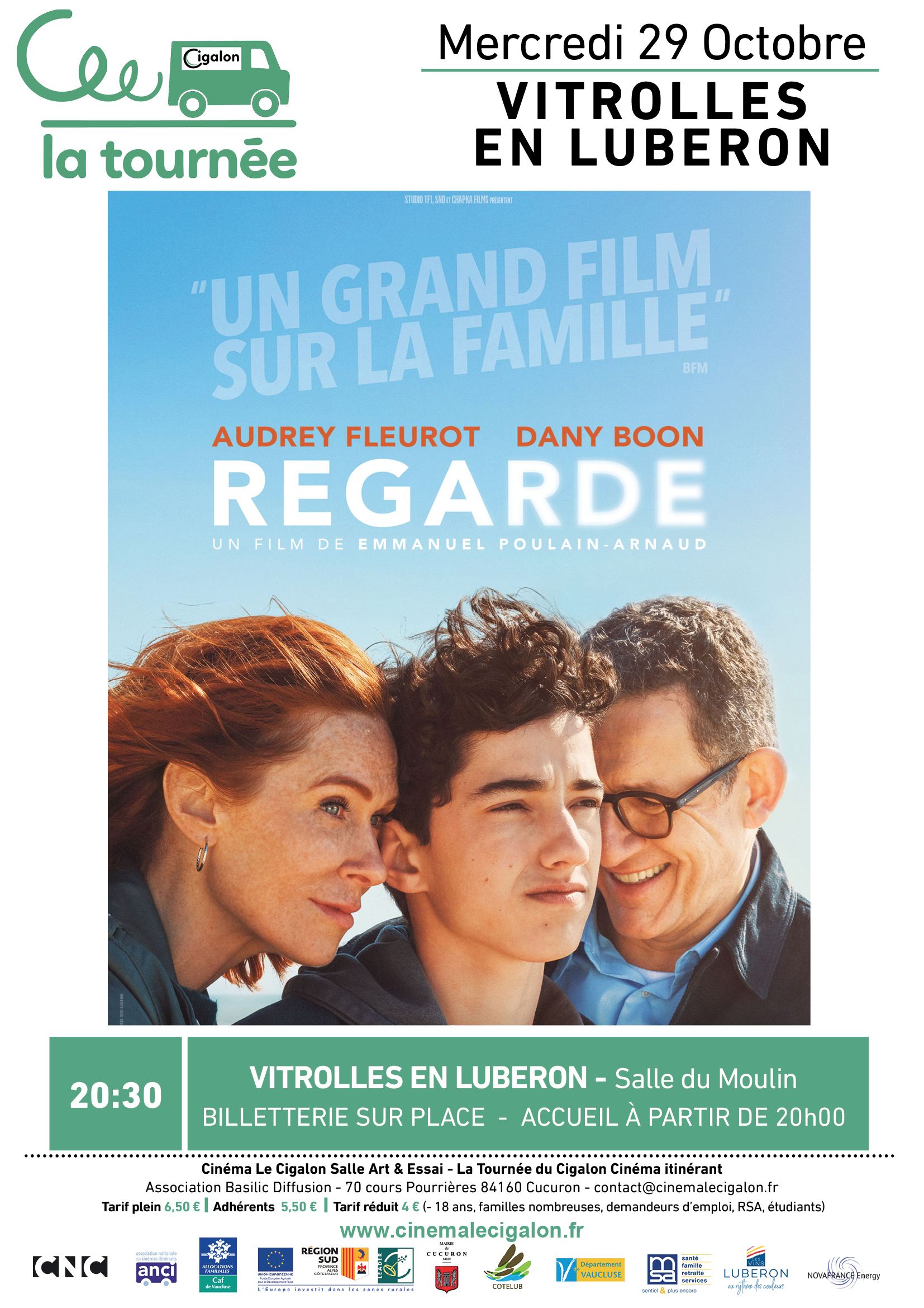 | À VITROLLES EN LUBERON, Salle du Moulin Mercredi 29 Octobre à 20H30 REGARDE Un film de Emmanuel Poulain-Arnaud Avec Audrey Fleurot, Dany Boon, Ewan Bourdelles Comédie dramatique - France - 2025 – 1H31 Chris et Antoine ont bien du mal à s’entendre depuis leur divorce. Mais, lorsqu’on leur annonce que leur fils de 16 ans est atteint d’une maladie rare, qui va lui faire perdre la vue, ils s’efforcent de mettre leurs rancœurs de côté. Les ex-conjoints embarquent leur fils pour des vacances inoubliables, bien décidés à lui offrir ses plus beaux souvenirs.  | |