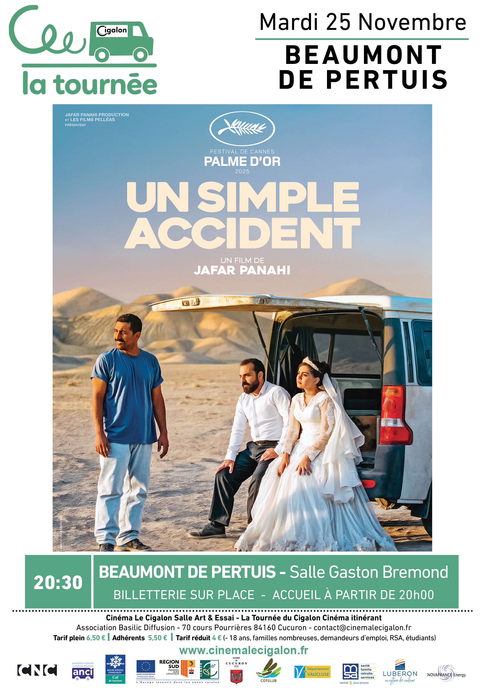 | À BEAUMONT DE PERTUIS, Salle Gaston Bremond Mardi 25 Novembre à 20H30 UN SIMPLE ACCIDENT Un film de Jafar Panahi Avec Vahid Mobasseri, Maryam Afshari, Ebrahim Azizi Thriller - Iran - 2025 – 1H42 Iran, de nos jours. Un homme croise par hasard celui qu’il croit être son ancien tortionnaire. Mais face à ce père de famille qui nie farouchement avoir été son bourreau, le doute s’installe. | |