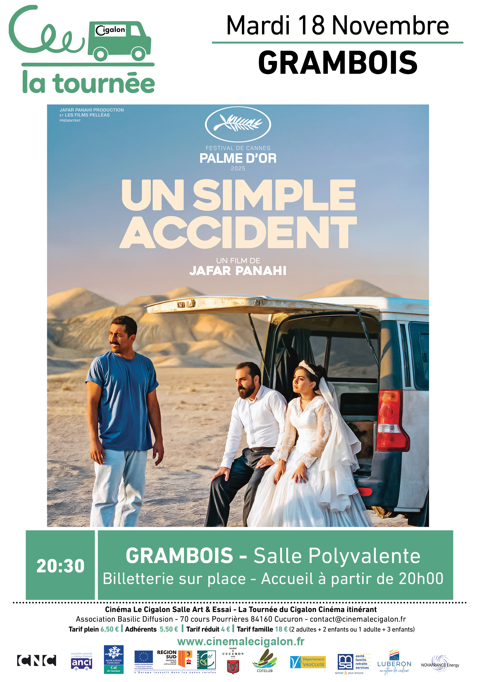 | À GRAMBOIS, Salle Polyvalente Mardi 18 Novembre à 20H30 UN SIMPLE ACCIDENT Un film de Jafar Panahi Avec Vahid Mobasseri, Maryam Afshari, Ebrahim Azizi Thriller - Iran - 2025 – 1H42 Iran, de nos jours. Un homme croise par hasard celui qu’il croit être son ancien tortionnaire. Mais face à ce père de famille qui nie farouchement avoir été son bourreau, le doute s’installe. | |