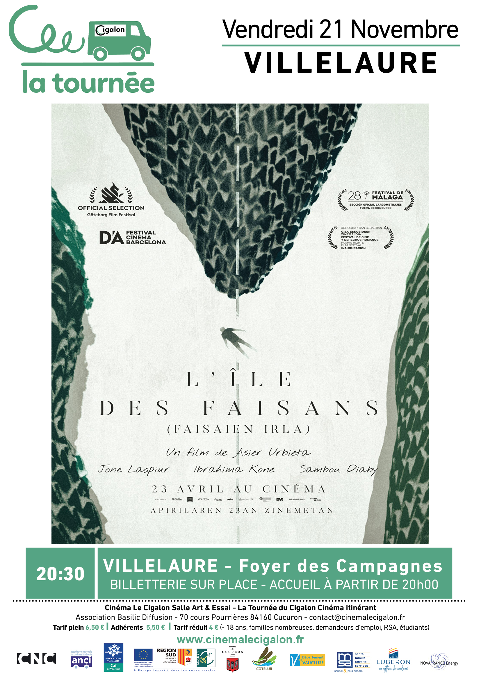 | À VILLELAURE, Foyer des Campagnes Vendredi 21 Novembre à 20H30 L'ÎLE DES FAISANS Un film de Asier Urbieta Avec Jone Laspiur, Sambou Diaby, Itziar Ituño Policier, Drame - Espagne, France - 2025 – 1H38 L'apparition d'un cadavre sur l'île des Faisans fait irruption dans la vie de Laida et Sambou, un jeune couple qui vit à la frontière de la Bidasoa. L'île des faisans est le plus petit condominium au monde. La moitié de l'année, elle appartient à l'État espagnol, et l'autre moitié à l'État français. Elle émerge au milieu de la rivière Bidasoa, frontière naturelle qui sépare les deux États. | |